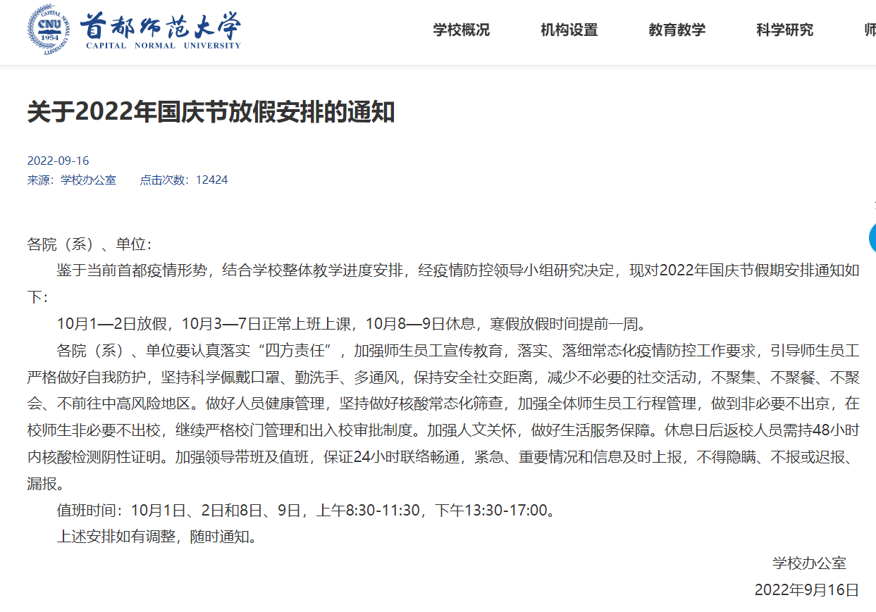 2022首都师范大学国庆期间放假时间安排(通知原文)