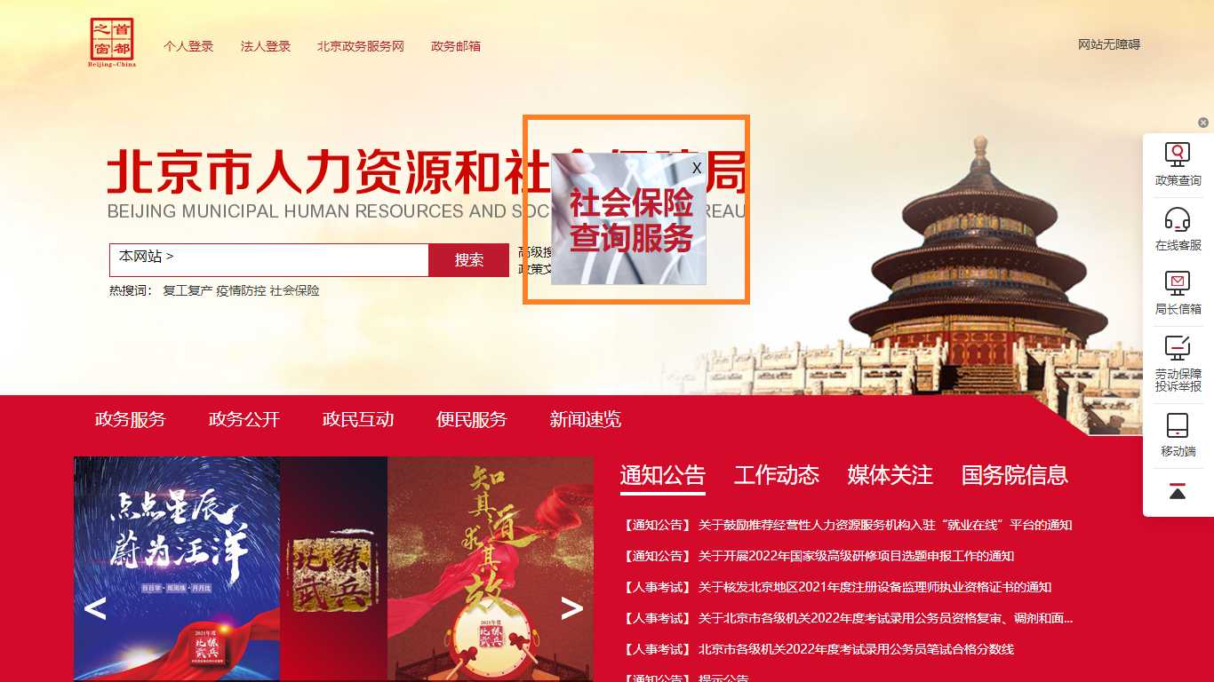 第一步:您可以登录“北京市人力资源和社会保障局”网站,点击移动窗口“社会保险查询服务”。