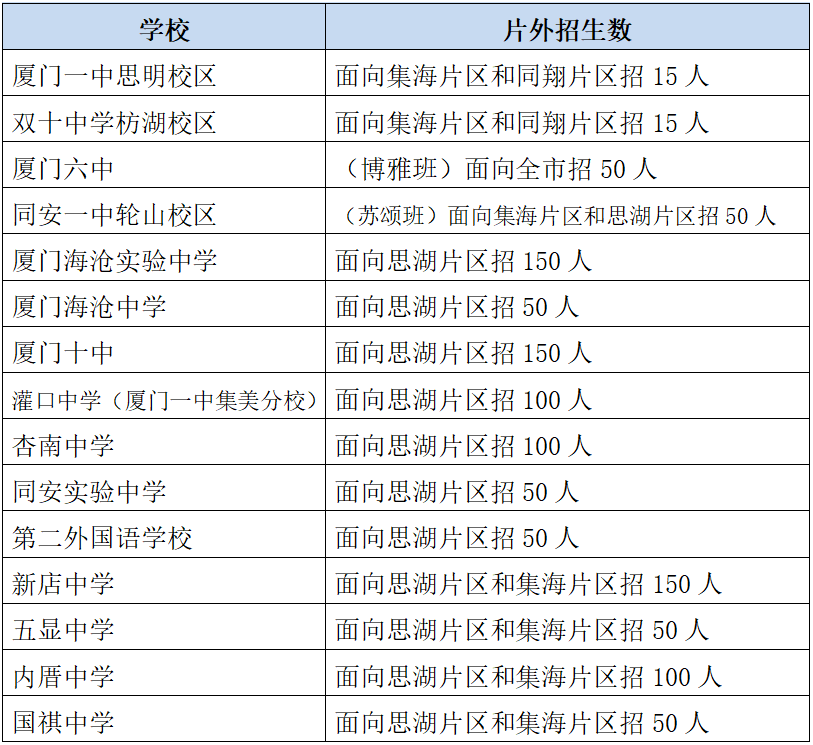 ➤ 厦门外国语学校海沧校区、集美中学普通生招生计划的35%指标面向集美海沧片区初中学校招收定向生,15%指标面向思明湖里片区初中学校招收定向生。