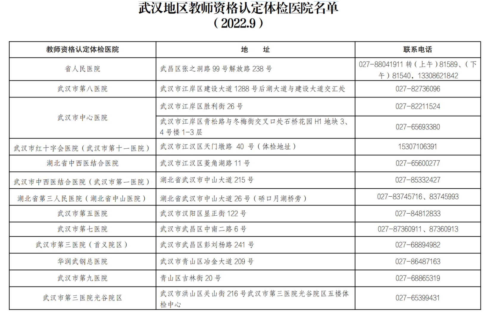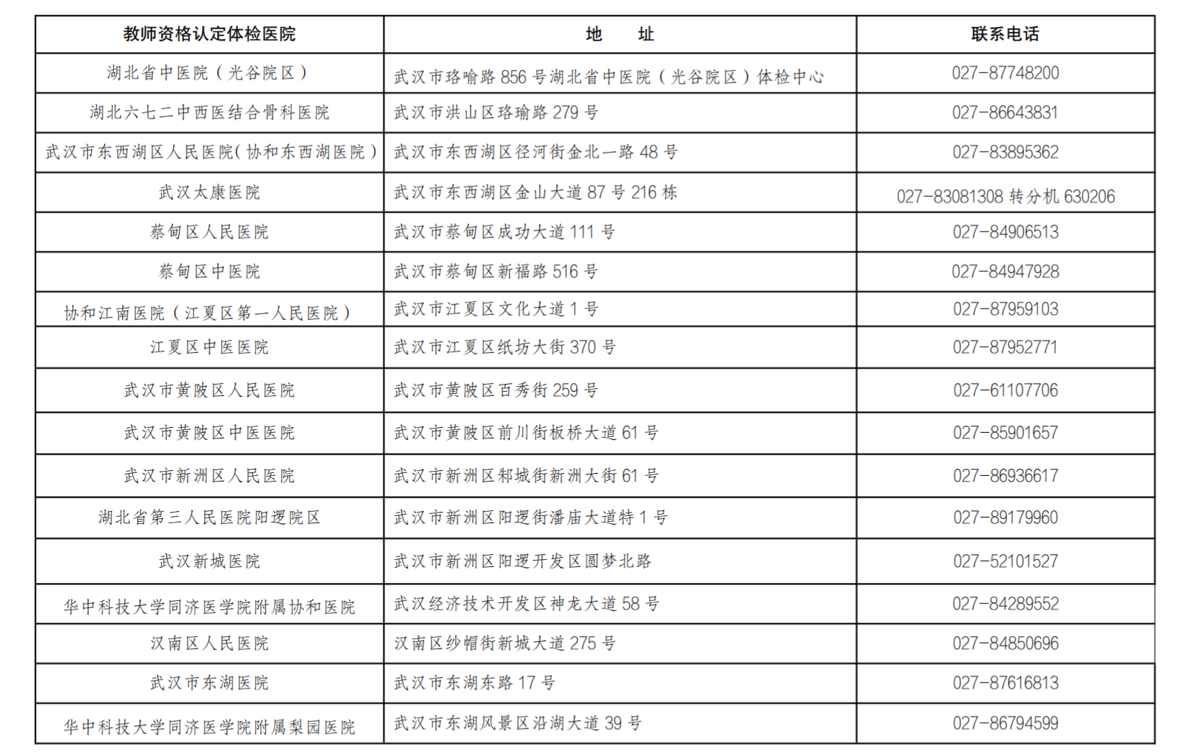 (三)体检机构:申请人从武汉地区教师资格指定体检医院名单中,任意选择一家医院进行体检;