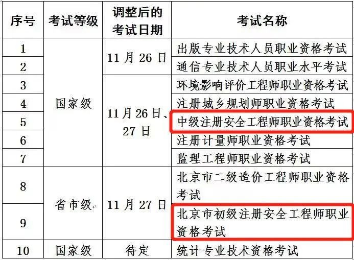 北京地区2022年度中级注册安全工程师职业资格考试、出版专业技术人员职业资格考试、环境影响评价工程师职业资格考试、注册城乡规划师职业资格考试、注册计量师职业资格考试、监理工程师职业资格考试等6项考试顺延至11月26日、27日举行。北京市初级注册安全工程师职业资格考试顺延至11月27日举行。