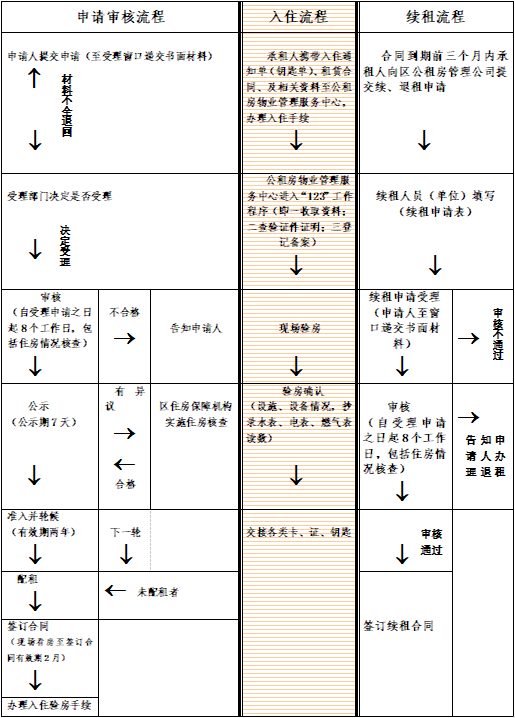 公共租赁住房可以向取得登记证的申请对象配租,也可以向单位集体配租,由单位安排符合条件的职工使用居住。区公共租赁住房运营机构按照“先申请先供应”的原则,制定房源供应方案,对房源供应紧张的,建立轮候制度;出租单位与承租人签订租赁合同,并办理网签备案手续,公共租赁住房合同期限一般为2年,在合同到期前3个月应向机构提出申请、重新审核,办理续租,享受公共租赁住房总年限累计不超过6年。