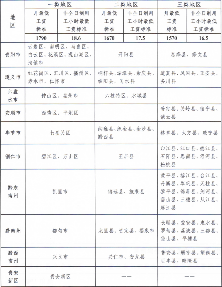 五、贵州省最低工资标准区域划分(执行时间:2019年12月1日)