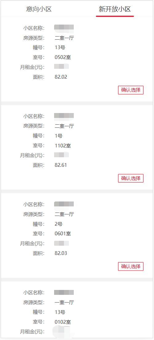 2、点击“确认选择”按钮,即可成功选择小区房源。如下图所示: