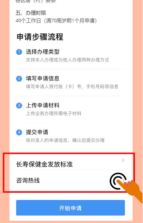 步骤4、查看申请指南并了解申请流程后,还有不清楚的地方,可以点击最下方“长寿保健金发放标准”和“咨询电话”了解详细内容。