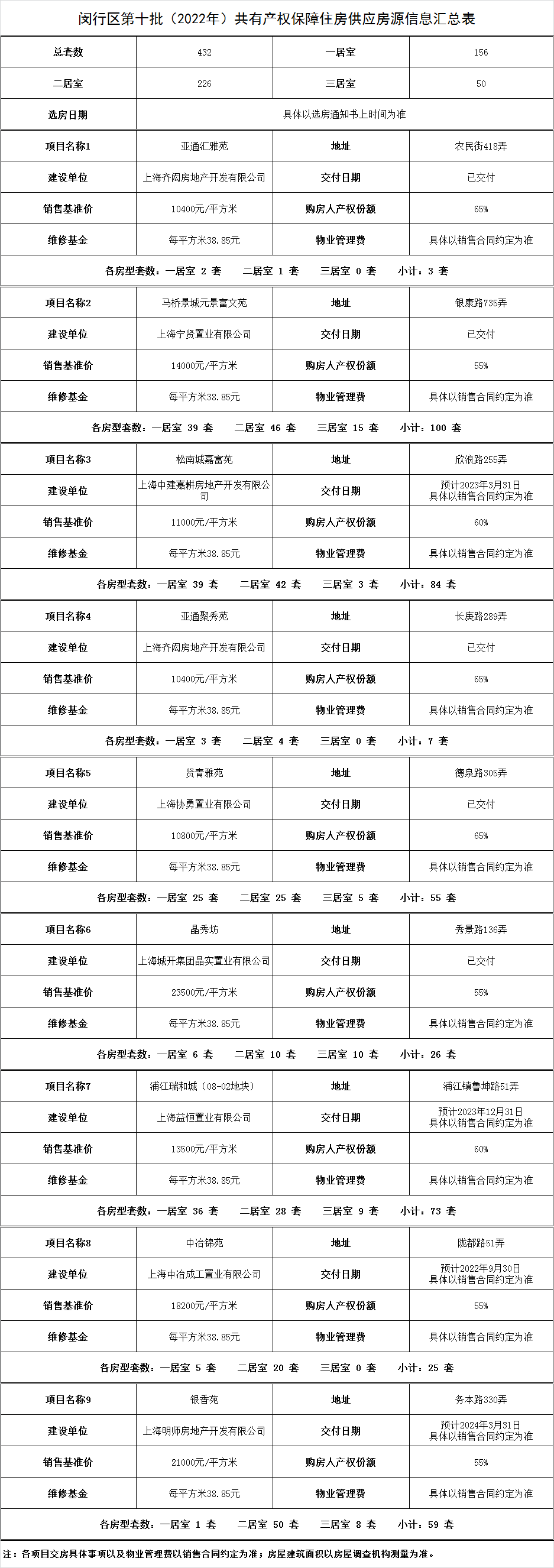 闵行区即将启动第十批(2022年)共有产权保障住房选房工作,具体房源信息如下: