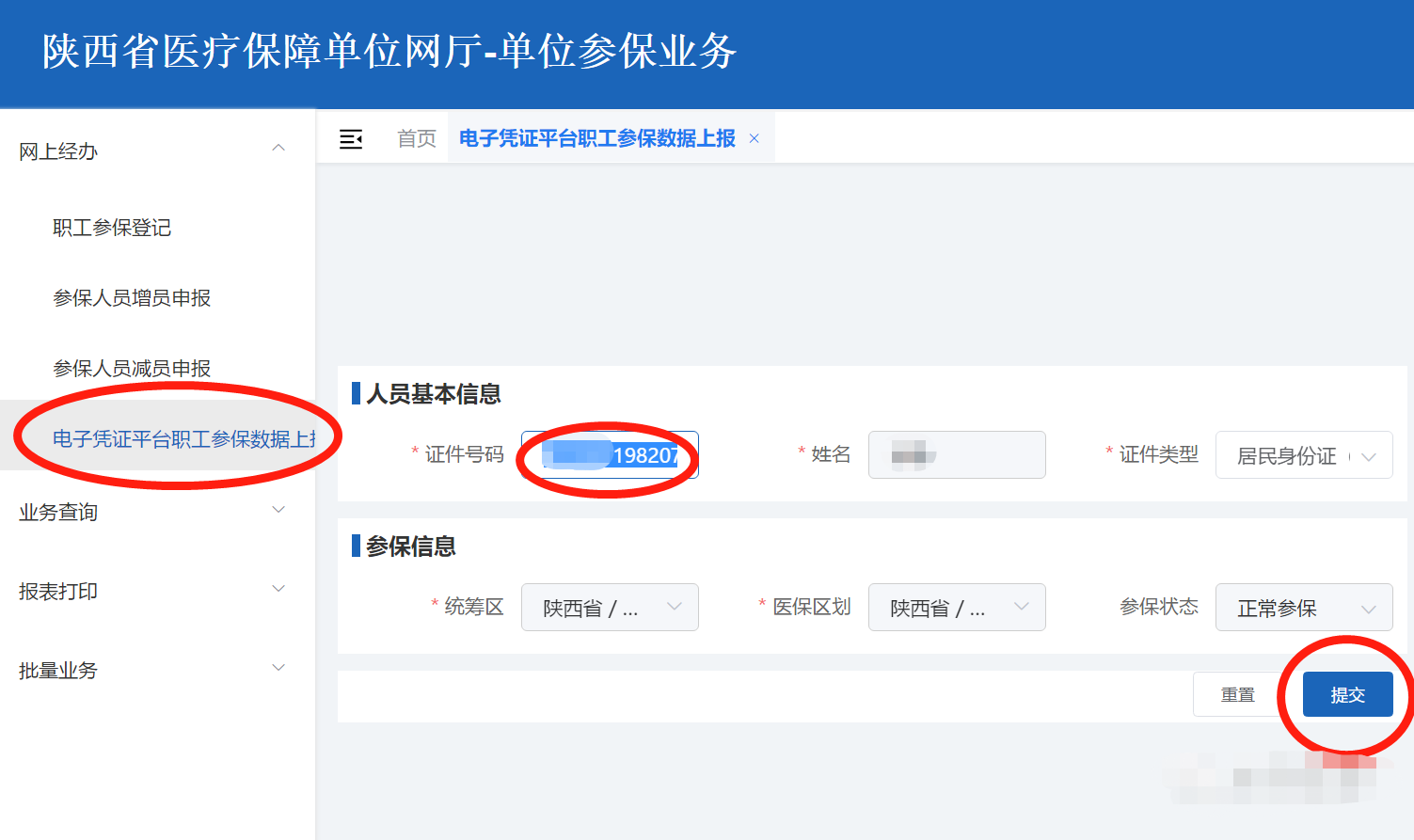 如单位参保人员反映医保电子凭证参保地没有西安市或者显示未参保,可在网上经办--电子凭证平台职工参保数据上报里办理医保电子凭证补报,输入职工身份证号码,点击提交,正常情况下半个小时后即可恢复正常。
