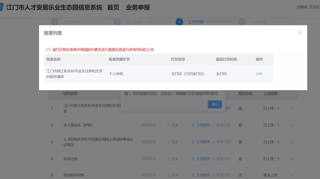 进入到申报系统的上传附件页面,将已完成单位审核的申请材料转换成电子材料上传到系统。