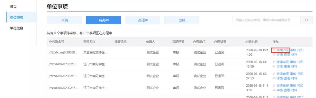 点击“继续申报”,可修改资料信息,或提交、补交、更换申请材料