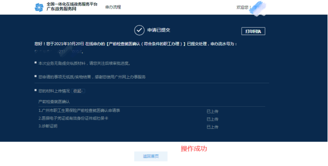 第十步:操作界面提示“申请已提交”后完成在线办理。广州市产前检查就医确认业务实行全市通办,所有医保分心中执行统一经办标准,选择任一分中心均不影响业务办理,,无需现场办理或者递送相关材料。。如有问题,您所选择的医保分中心将通过电话或短信与您联系。请您截屏保存该页面,或保留申办流水号(或受理编号),以备后续查询使用。