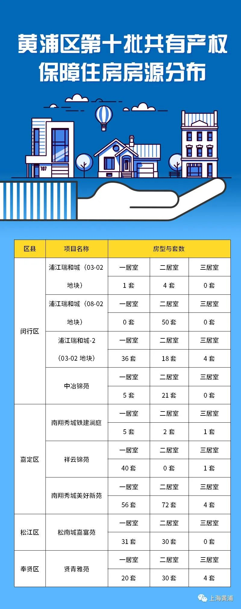 2022年,黄浦区第十批共有产权保障住房房源分布在闵行区、嘉定区、松江区和奉贤区,共有9处项目。总套数为435套,其中一居室194套,二居室227套,三居室14套。
