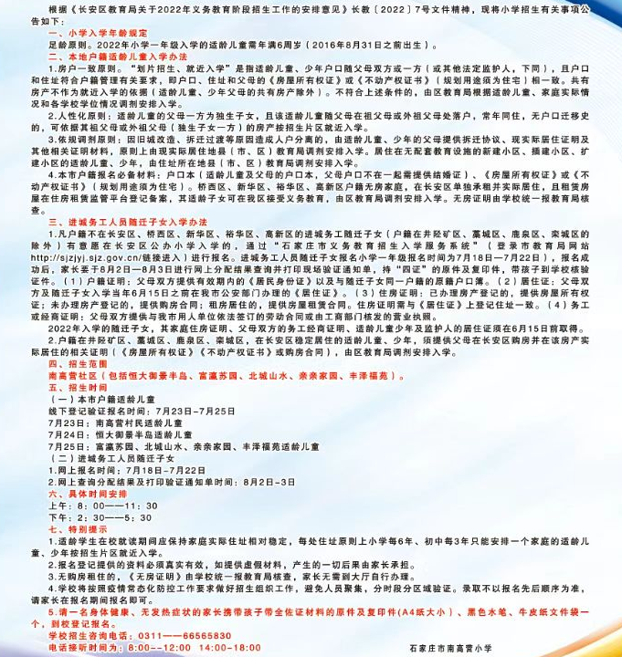 2022石家庄南高营小学招生简章如下: