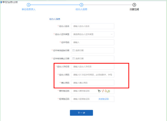 单位注册完成后,下一步自动跳转至经办人注册页面,单位经办人如实填写个人信息,并使用常用手机号进行注册。经办人账号为接收验证码的手机号,登录密码为这里设置的经办人密码。