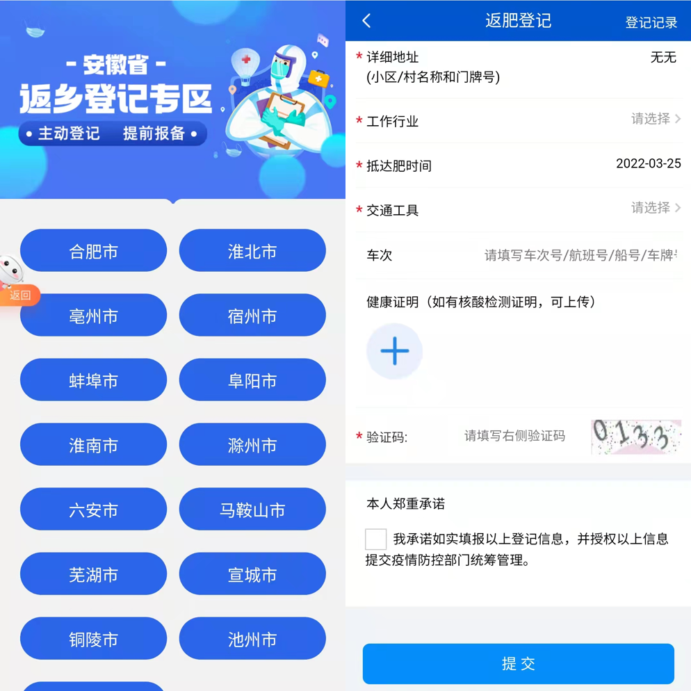 返乡登记人员通过手机,实名登录“皖事通”APP,即可填写提交个人返乡信息。