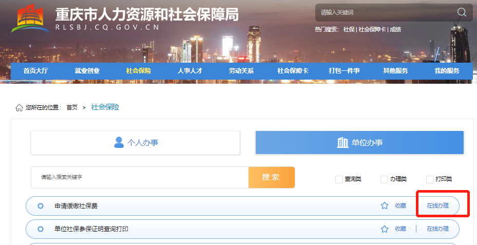 通过进入“重庆市人力资源和社会保障局”官网(点此进入),点击“我要办”——“申请缓缴社保费”,直接进入。