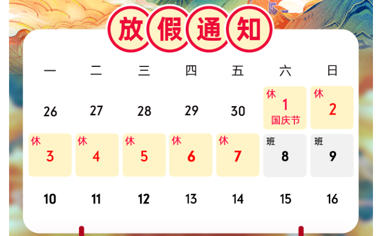 根据国家和本市对2022年国庆节的休假安排,上海市公积金管理中心及其各区管理部2022年10月1日(星期六)至10月7日(星期五)共七天停止对外办公和受理业务。原周六对外办公的三个管理部服务网点(黄浦、徐汇、浦东)在此期间也停止对外办公和受理业务。10月8日(星期六)和10月9日(星期日)正常对外办公和受理业务。