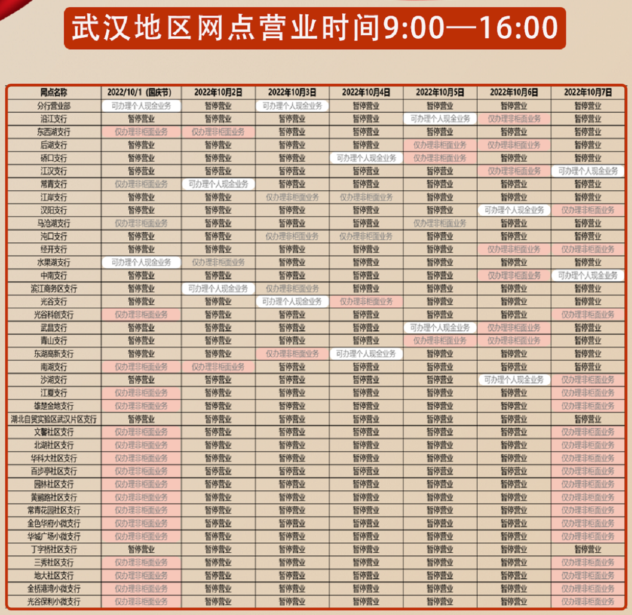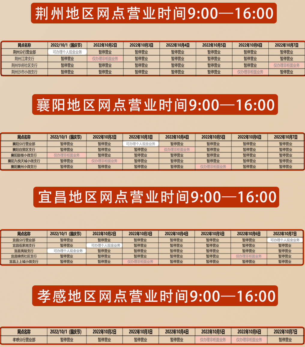 2022年浦发银行武汉分行国庆节假期营业时间公告
