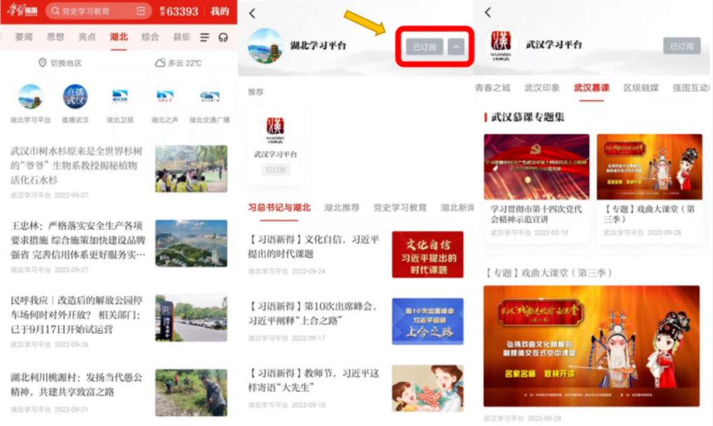 登录“学习强国”平台→湖北→选择“湖北学习平台”→点击右上角已订阅旁边的小图标→选择武汉学习平台→武汉慕课,即可观看《戏曲大课堂》(第三季)的节目了。