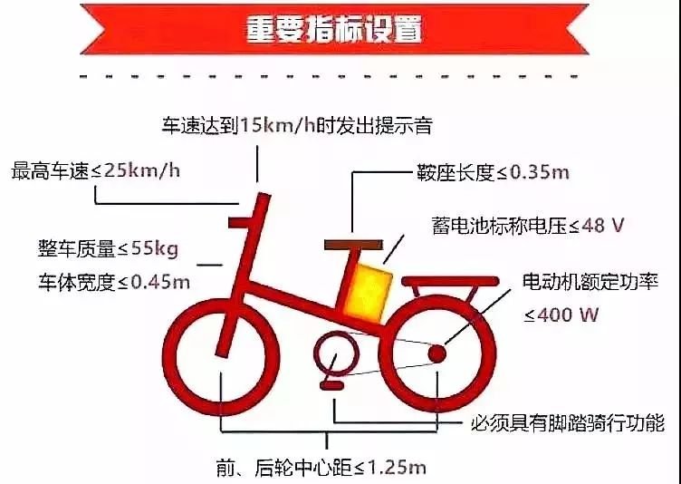 电动自行车最高设计时速不超过25km/h;整车质量(重量)小于或等于55kg;电动机额定连续输出功率小于或等于400W;蓄电池标称电压小于或等于48V,同时要获得CCC认证。