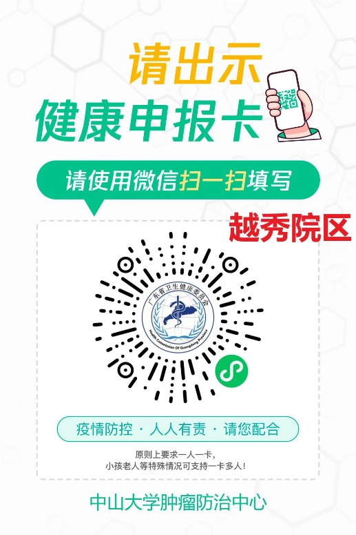1.门急诊患者及陪护人员(原则上限1人)进入医院请配合完成“四必查一询问”:请全程佩戴好口罩,配合完成体温检测,扫码出示中肿“穗康通行码”、“健康申报卡(为节约您的入院时间,可提前24小时填写后截图出示)”,请如实配合完成近7天内的流行病学史询问。