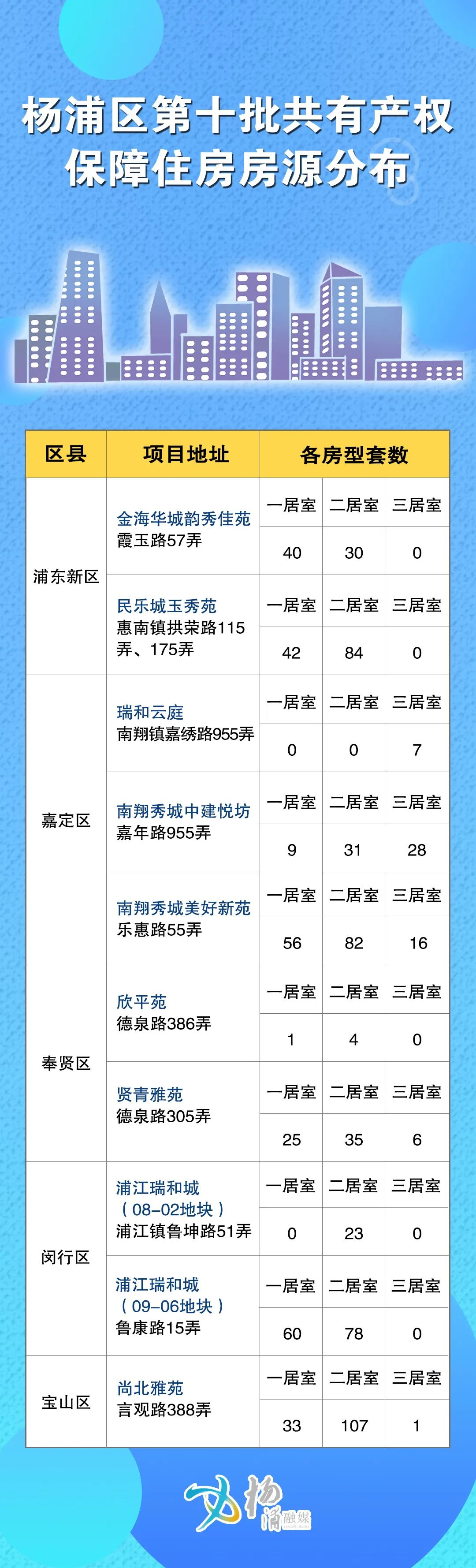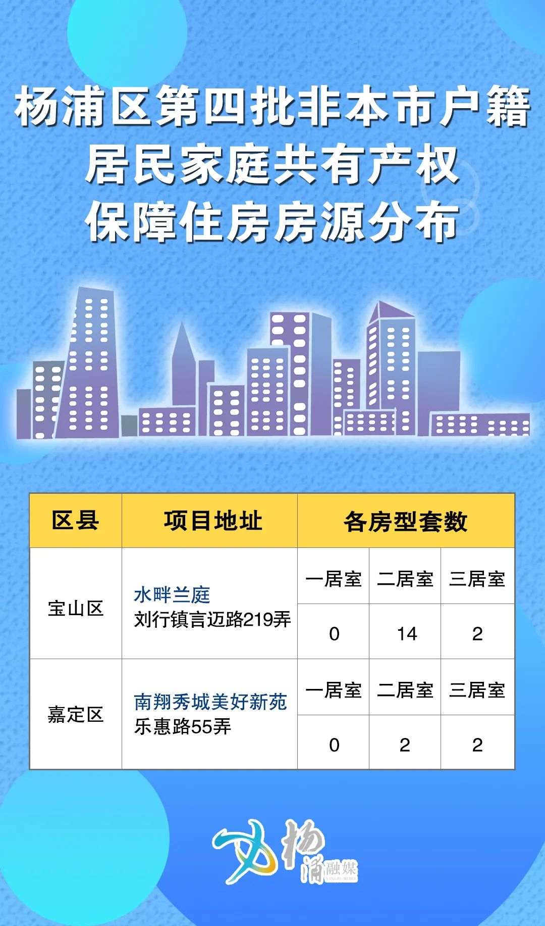 此次非本市户籍居民家庭共有产权保障住房房源分布于宝山、嘉定,总套数20套,其中二居室16套、三居室4套。