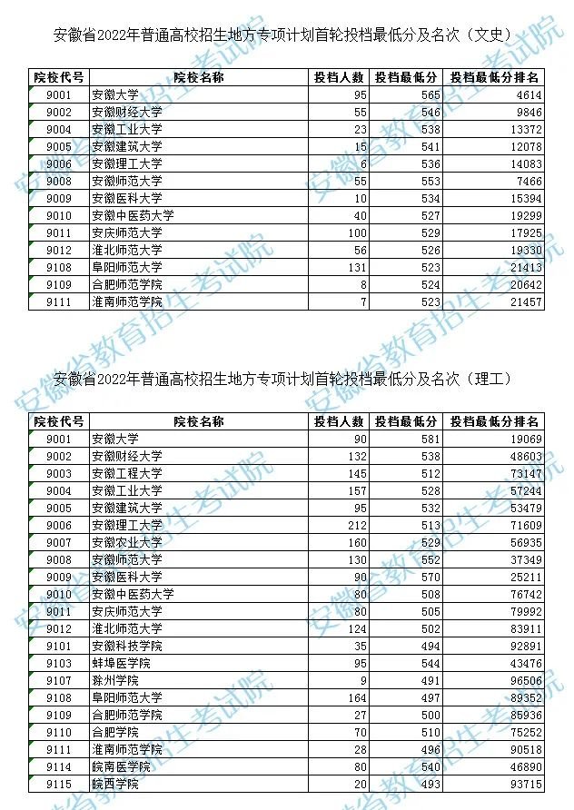 安徽省2022年普通高校招生地方专项计划首轮投档最低分及名次