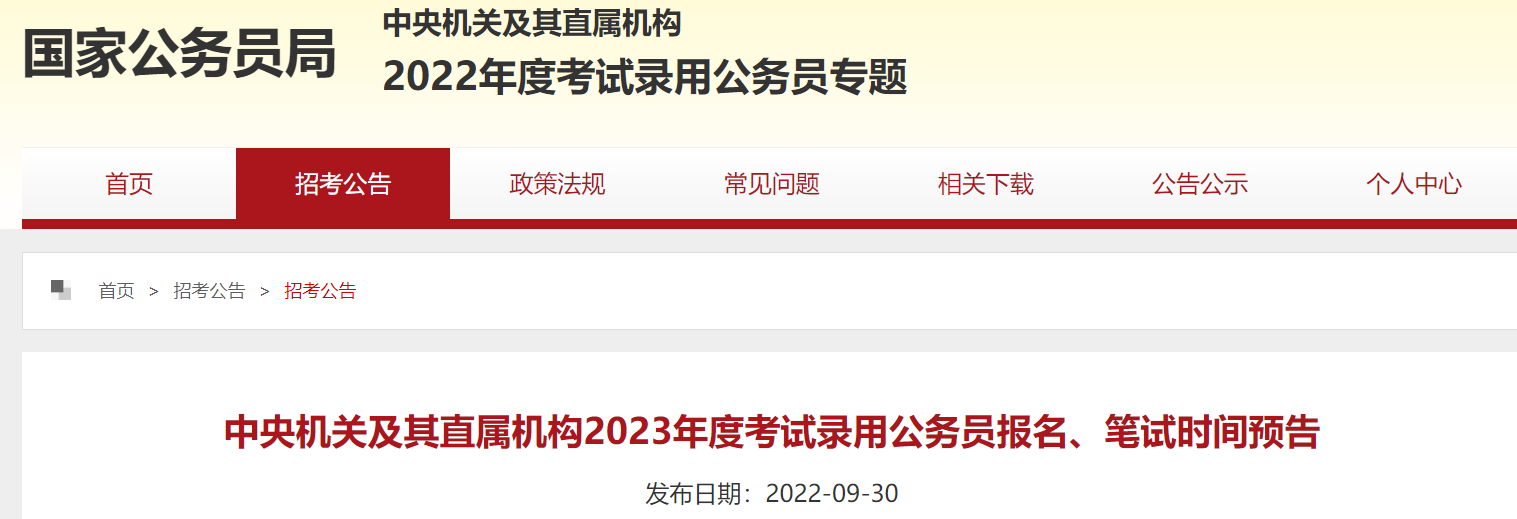 中央机关及其直属机构2023年度考试录用公务员报名、笔试时间预告