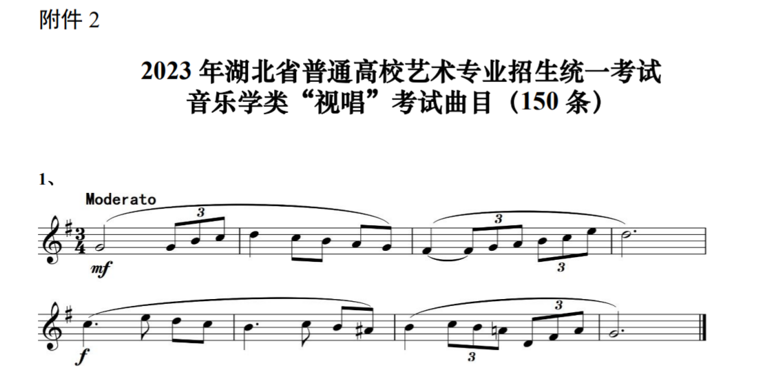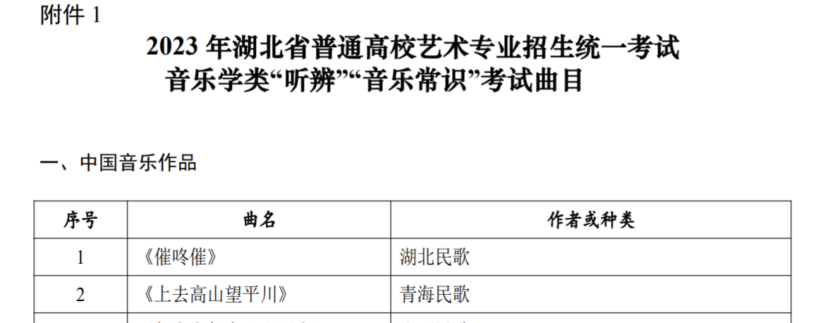 湖北省教育考试院发布了《2023年湖北省普通高校艺术专业招生统一考试音乐学类考试大纲》,内附湖北省音乐统考曲目库。