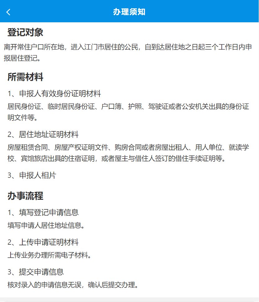 离开常住户口所在地,进入江门市居住的公民,自到达居住地之日起三个工作日内申报居住登记。