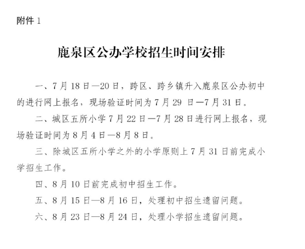 (三)简化优化报名入学手续1.鹿泉区公办小学、初中采取登记入学方式。本地户籍适龄儿童、少年,由其父母持身份证明、家庭户籍证明、合法常住固定住所证件等有关材料,小学到片区所属学校登记报名(除鹿泉区育才小学、鹿泉区实验小学、鹿泉区第二实验小学、鹿泉区第三实验小学、鹿泉区获鹿镇五六街小学城区五所小学外)。城区五所小学报名采取网上报名的形式,家长于7月22日—7月28日通过“鹿泉区义务教育招生入学服务平台”(登录鹿泉区人民政府网站http://www.sjzlq.gov.cn链接进入)报名办理。初中由中心校统一组织办理相关手续采取登记或对口直升方式入学。跨区、跨乡镇小升初由区教育局统一组织办理相关手续。2.因家庭住址迁移等原因,需跨县(区)、跨乡镇升入我区公办初中的小学毕业生,需填写《石家庄市小升初跨县(区)转学证明表》(见附件3)或《鹿泉区小升初跨乡(镇)转学证明表》(见附件4),并于7月18日—7月 20日通过“鹿泉区义务教育招生入学服务平台”(登录鹿泉区人民政府网站http://www.sjzlq.gov.cn链接进入)报名办理。报名成功后,家长需打印并携带平台生成的信息表,按要求进行现场验证。鹿泉区小学毕业生需跨入长安区、桥西区、新华区、裕华区、高新区就读公办初中的,填写《石家庄市小升初跨县(区)转学证明表》(见附件3),通过“石家庄市义务教育招生入学服务系统”(登录市教育局网站http://sjzjyj.sjz.gov.cn/链接进入)报名办理,报名时间为7月24日--7月26日。各中心校及各学校要按照疫情常态化防控工作要求做好招生组织工作,优化报名程序,分时段分区域验证,避免人员聚集,确保招生报名、验证、入学报到等各环节安全有序,其中预防接种证明不作为入学报名前置条件,可在开学后及时要求学生提供。同时,要本着便民、高效的原则,信息非必要不提供、非必要不采集,应当采集学生基本信息、家庭住址及家长姓名、联系方式等必要信息,严禁采集学生家长职务和收入信息。信息采集工作应在招生入学时一次性采集,不得利用各类APP、小程序随意反复采集学生相关信息。