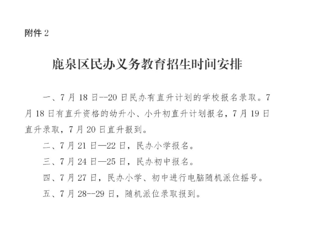 (五)规范报名派位录取程序全区民办学校招生统一通过“石家庄市义务教育招生入学服务系统”进行报名。民办学校不得自行组织招生报名,不得进行任何形式的提前预报名,私下预录取结果一律无效。每名适龄儿童、少年可填报1所学校作为第一志愿,并可选填1所学校作为第二志愿。双(多)胞胎子女填报信息时,家长可申请“双(多)胞胎绑定”参加电脑随机派位,双(多)胞胎派位将产生一个派位结果,如派位录取,则组合绑定的双(多)胞胎均被录取;如派位未录取,则组合绑定的双(多)胞胎均不录取。报名结束后,主管县级教育行政部门联合民办学校对报名信息进行审核,确定符合条件的有效报名信息。当第一志愿报名人数小于或等于学校招生计划时,予以全部录取;当第一志愿报名人数超过学校招生计划时,采取电脑随机派位方式确定录取结果。按学生的第一志愿未招足计划数的学校,剩余计划数按学生的第二志愿采用电脑随机派位方式进行招录。随机派位工作由主管县级教育行政部门在确保网络环境安全稳定的条件下组织进行。随机派位过程实行一次性序号排位,对每个报名学生进行排序,排在招生计划数以内序号的学生确定为录取学生。随机派位过程邀请纪检监察部门、人大代表、政协委员、新闻媒体、中小学教师代表、学生家长代表等参与监督,实行全程录像,确保随机派位过程公平、公正、公开。通过第二志愿仍未在鹿泉区招满的且审批机关为市级及以上政府教育行政部门或行政审批部门的,剩余计划可以向区教育局申请,区教育局研究同意后,向市教育局申请,经市教育局批准,可在审批机关管辖区域内适当跨县进行补录,但不得跨设区市招生;审批机关为县级政府教育行政部门或行政审批部门的民办学校,原则上不再进行补录,如确实有需求进行招生情况调整的,可以向区教育局申请,区教育局研究同意后,向市教育局申请。补录报名方式及办法参照首次报名流程,具体时间另行通知。