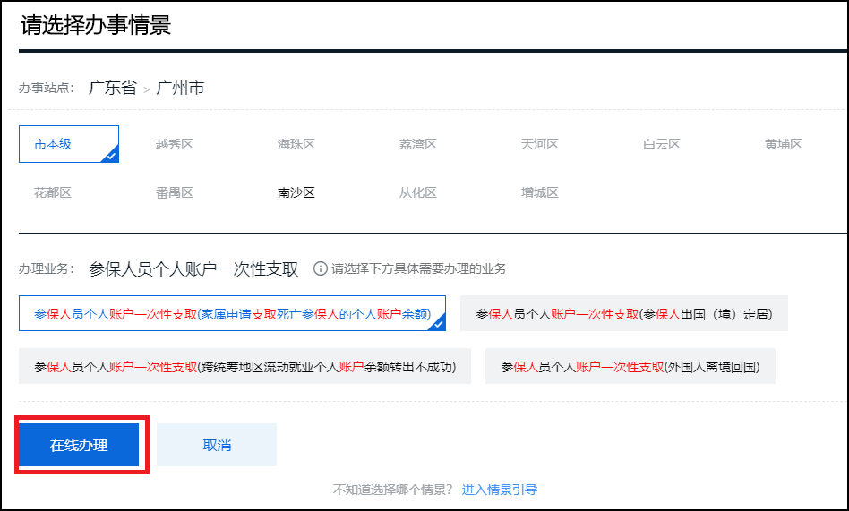 (五)选择办事站点(默认为“市本级”),选择对应的业务情况,如“参保人员个人账户一次性支取(家属申请支取死亡参保人的个人账户余额)”,点击“在线办理”。