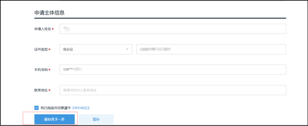 (八)填写经办人信息、申请主体信息,点击“保存并下一步”。