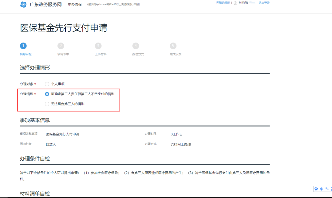 4.选择“医疗保险先行支付申请”,根据申请类型选择“无法确定第三人的情形”或“可确定第三人责任但第三人不予支付的情形”。