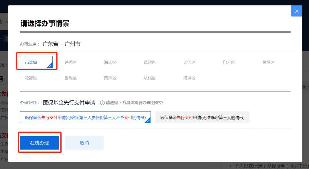 5.办事站点选择“广州市”(请勿选择到区),并选择具体业务情形,点击“在线办理”。
