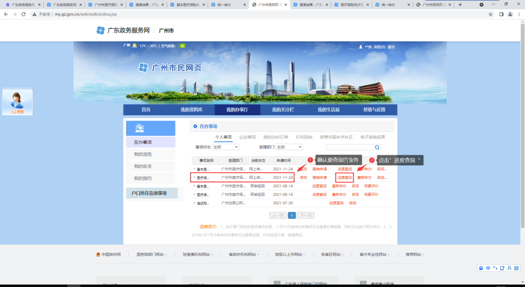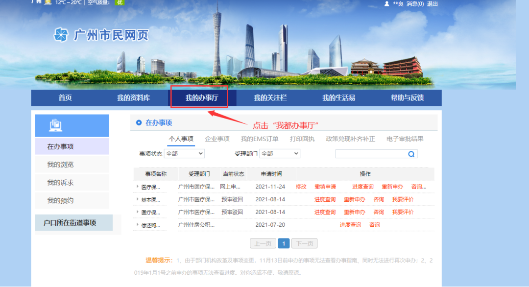 1.提交申请后,打开“广州市民网页”,进行实名认证登录后,点击“我的办事厅”。