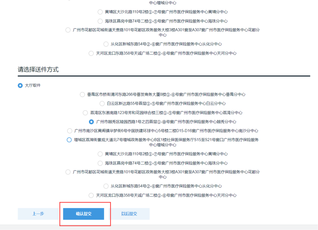 11.系统默认需选择办理方式与送件方式,“办理方式”选择任一分中心均不影响业务办理,无需现场办理或者递送相关材料,点击“确认提交”。