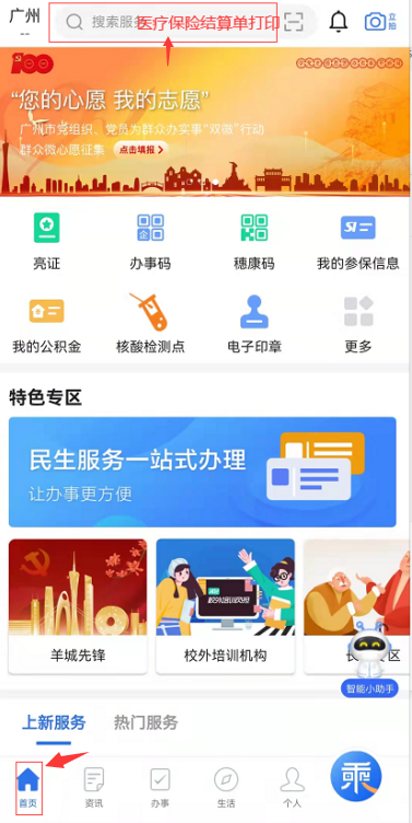 1.登录“穗好办”App,在首页搜索“医疗保险结算单打印”。