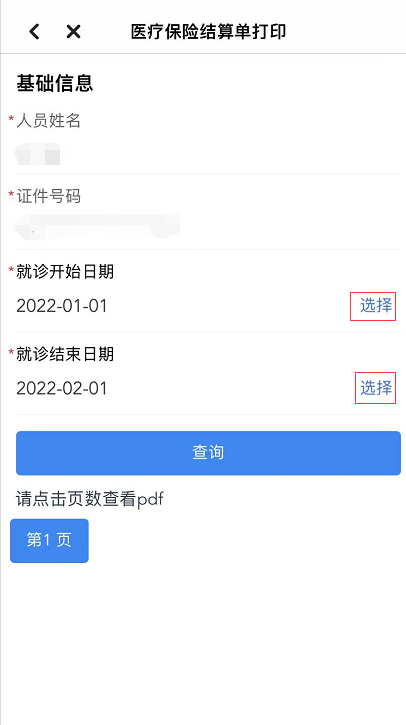 3.通过“选择”按钮录入“就诊开始日期”和“就诊结束日期”(注意这里开始和结束日期中间间隔不超过两个月),点击“查询”。