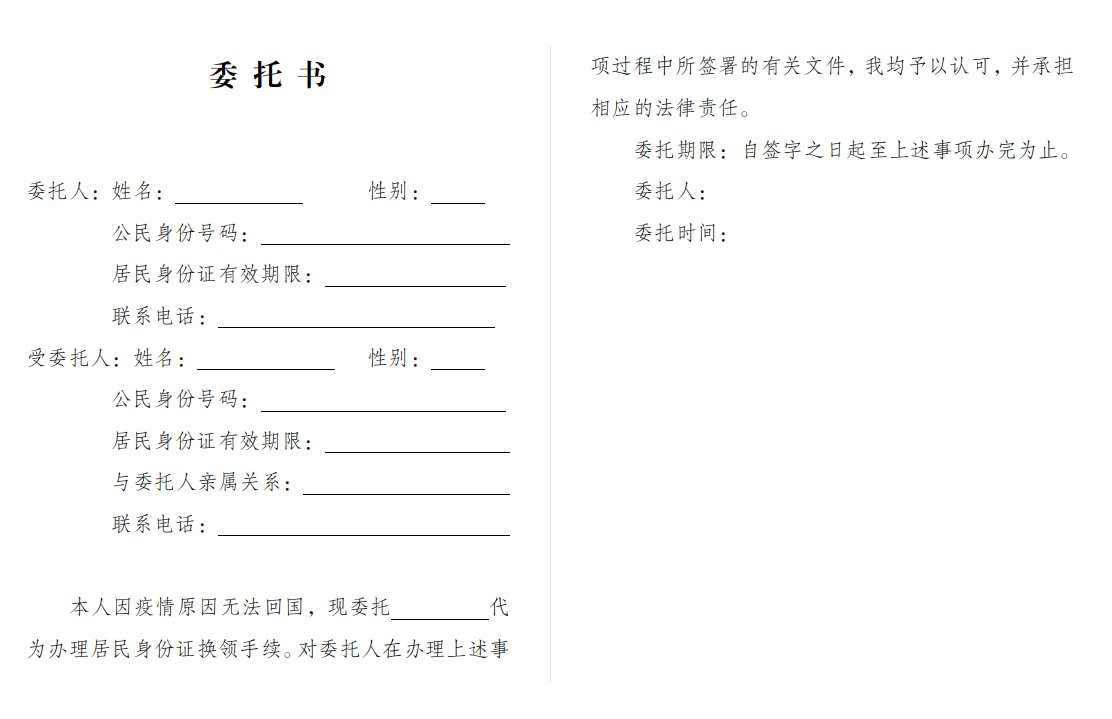 1、申请人(以下统称“委托人”)签名确认的委托书:须写明委托人姓名、公民身份号码等基本情况,居民身份证有效期限,受托人姓名、公民身份号码、与委托人亲属关系,委托申请事项、联系方式(委托书可提供扫描件或数码照片,交由受理窗口打印存档);