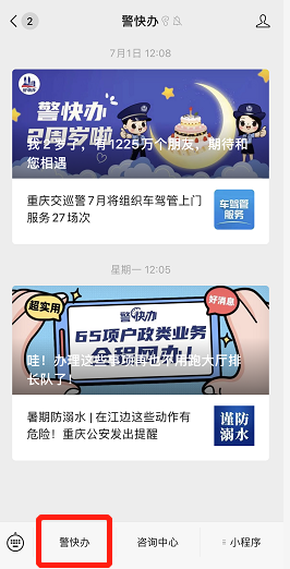 第一步:微信搜索并关注“警快办”;关注后在底部菜单栏位置点击“警快办”进入办事中心;