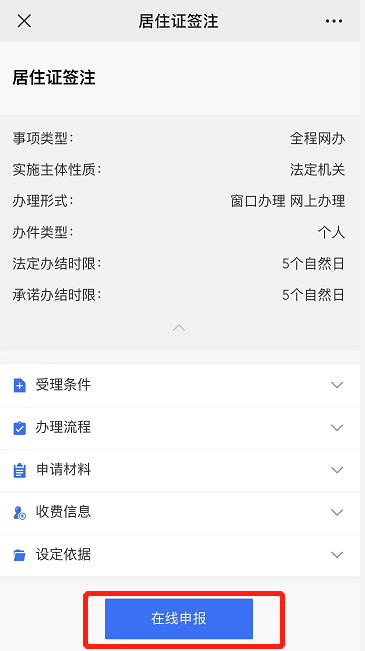 第四步:点击“居住证签注(全程网办)”,进入居住证签注界面,点击“在线申报”,根据提示进行操作即可申请。