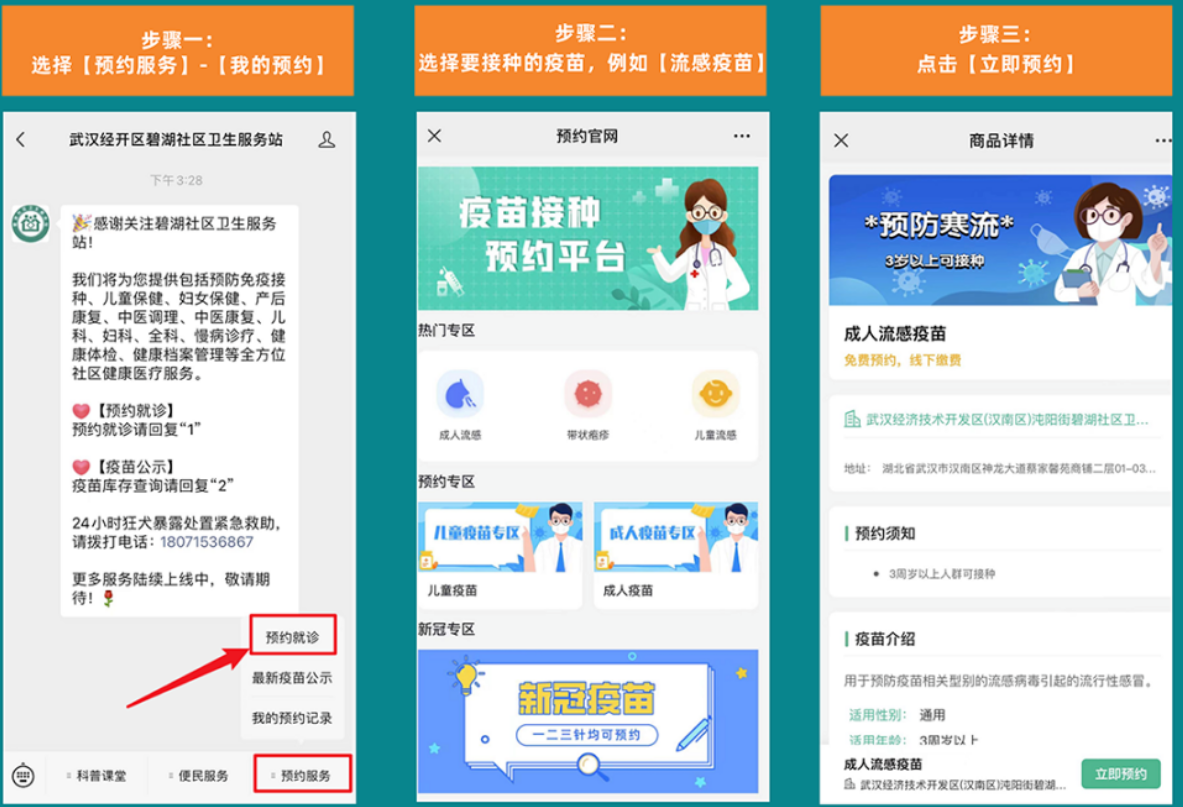 01通过公众号【武汉经开区碧湖社区卫生服务站】进行预约。