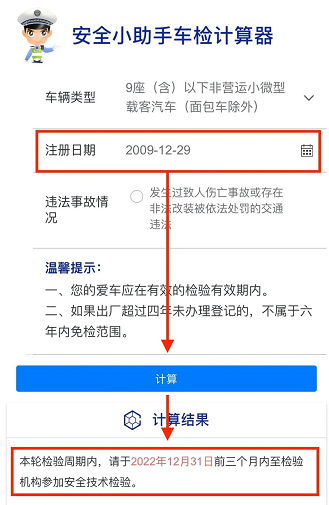 为方便群众查询检验日期,公安交管部门设计了“车检计算器小程序”,大家可以登录公安部交通管理局微信公众号,按照车辆注册登记时间查询检验周期。