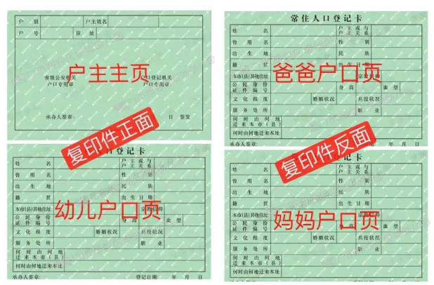 (四)户口本复印件:户口本首页、户主户口页、爸爸户口页、妈妈户口页、幼儿户口页