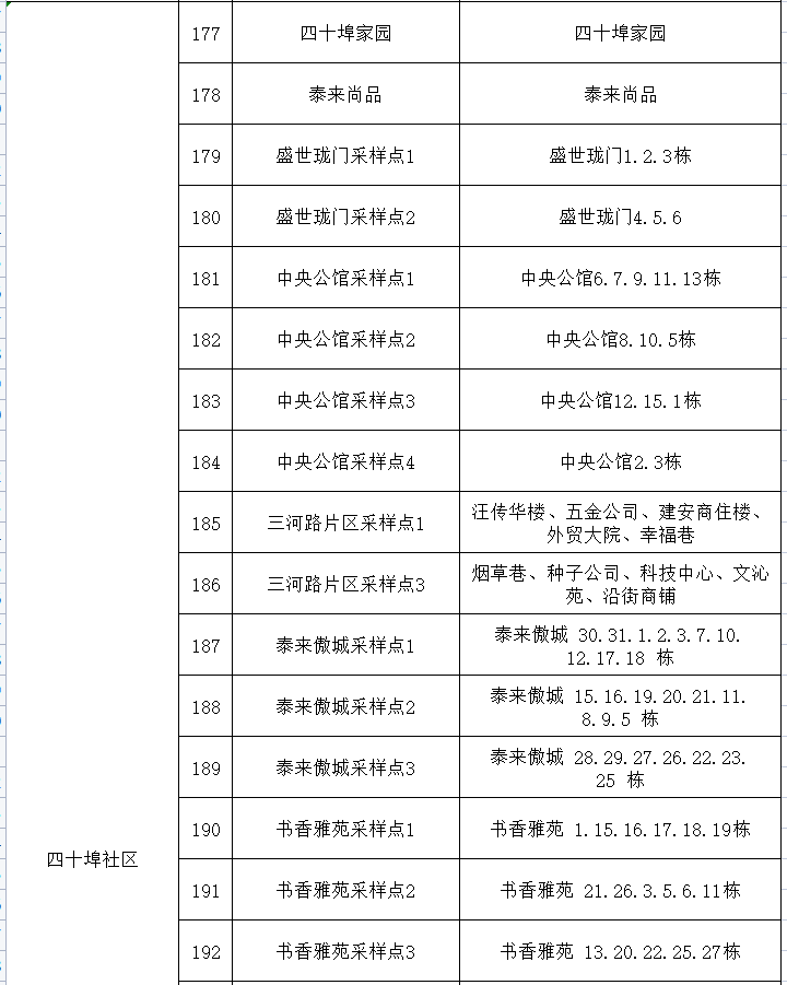 为全面做好应对突发疫情的各项准备工作,现将肥西县四十埠社区突发疫情时核酸检测采样点公示如下,请广大居民知悉,一旦发生疫情需要开展全员核酸检测时,请积极配合社区(村),主动到居住地相对应的采样点接受核酸采样工作,提前准备好核酸检测预登记码,戴好口罩、保持距离,快速有序地完成核酸采样工作,为更快发现并阻断疫情赢得时间。