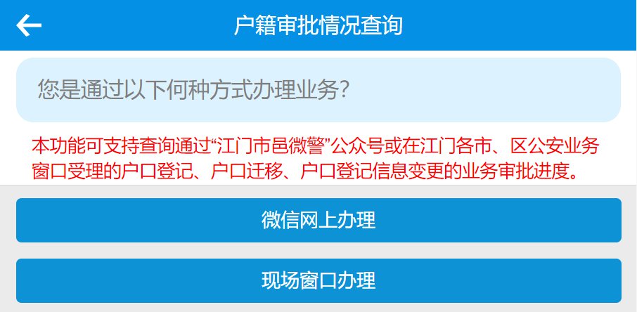 该功能可支持查询通过“江门市邑微警”公众号或在江门各市、区公安业务窗口受理的户口登记、户口迁移、户口登记信息变更的业务审批进度。