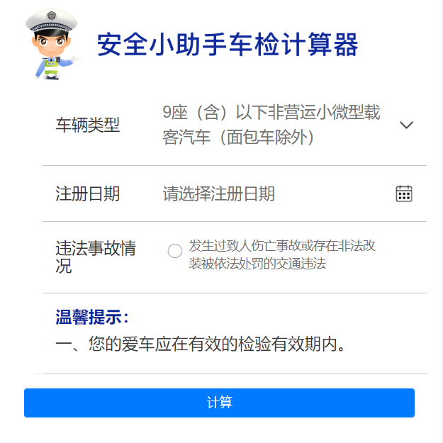 同时,为便利群众查询检验日期,公安交管部门设计了“车检计算器小程序”,大家可以登录公安部交通管理局微信公众号,按照车辆注册登记时间查询检验周期。