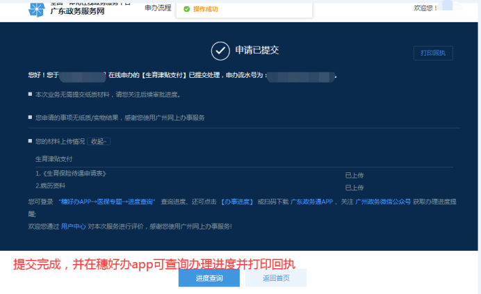 第八步:完成资料上传即可,广州市生育津贴支付业务实行全市通办,所有医保分心中执行统一经办标准,选择任一分中心均不影响业务办理,也不需要到现场递送相关材料,直接确认提交就可以了。如有问题,您所选择的医保分中心将通过电话或短信与您联系。请您截屏保存该页面,或保留申办流水号(或受理编号),以备后续查询使用。