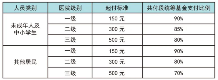 参保人每次住院基本医疗费用统筹基金的起付标准、共付段统筹基金支付比例为: